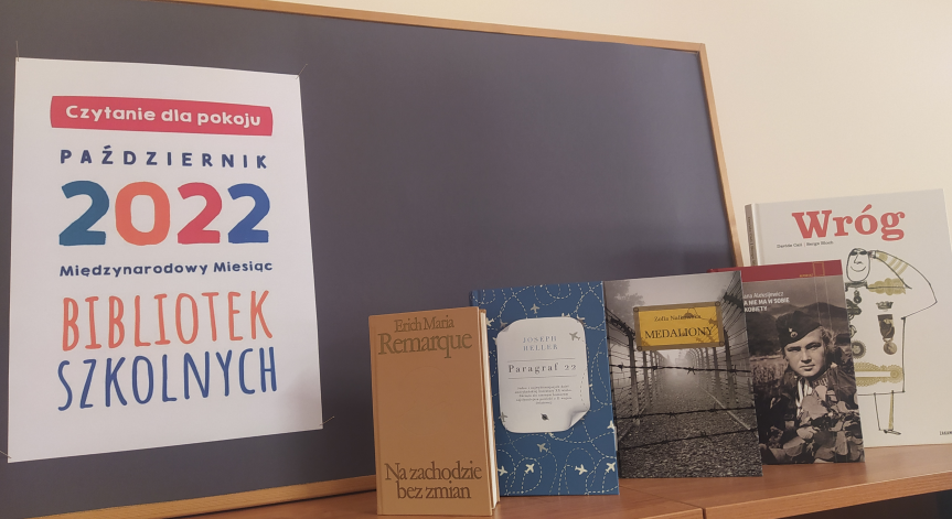 Nasza biblioteka również przyłączyła się do akcji. W myśl słów Benjamina Franklina, że „nigdy nie było dobrej wojny i złego pokoju” nauczyciele bibliotekarze polecają dla uczniów ZS nr 2 w Kraśniku kilka propozycji literackich, które skłaniają czytelnika do refleksji nad tematyką wojenną, pokojem i wolnością na świecie. Zachęcamy uczniów naszej szkoły do czytania tak wartościowych pozycji literackich jak : wiersz Wisławy Szymborskiej Koniec i początek, Czesława Miłosza Campo di Fiori, powieści: Rozmowa z Katem Kazimierza Moczarskiego opatrzonej wstępem Normana Davisa, Na zachodzie bez zmian Ericha Maria Remarque, Pargraf 22 Josepha Hellera, Zaniemówienie Justyny Wydry, Wojna nie ma w sobie nic z kobiety