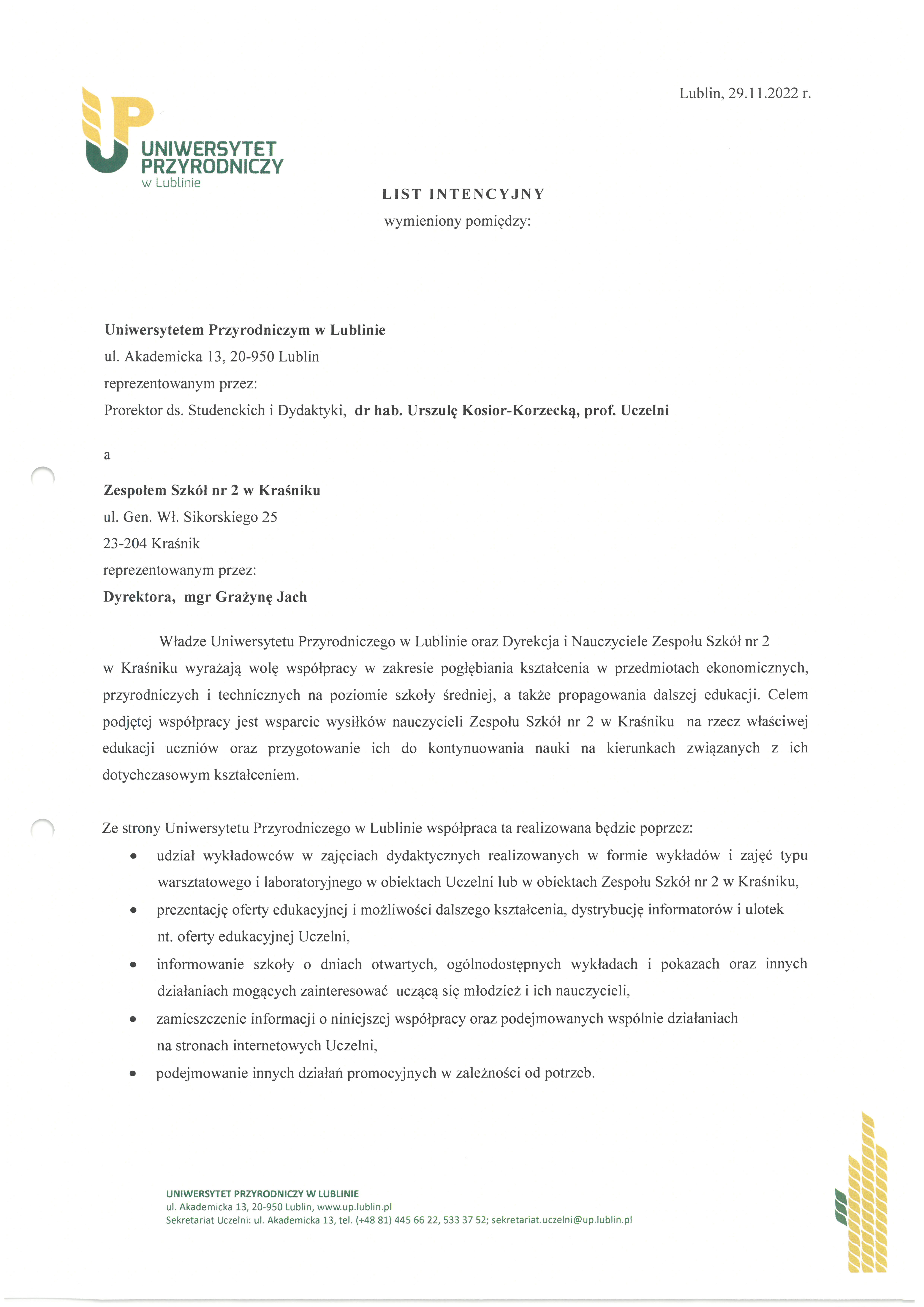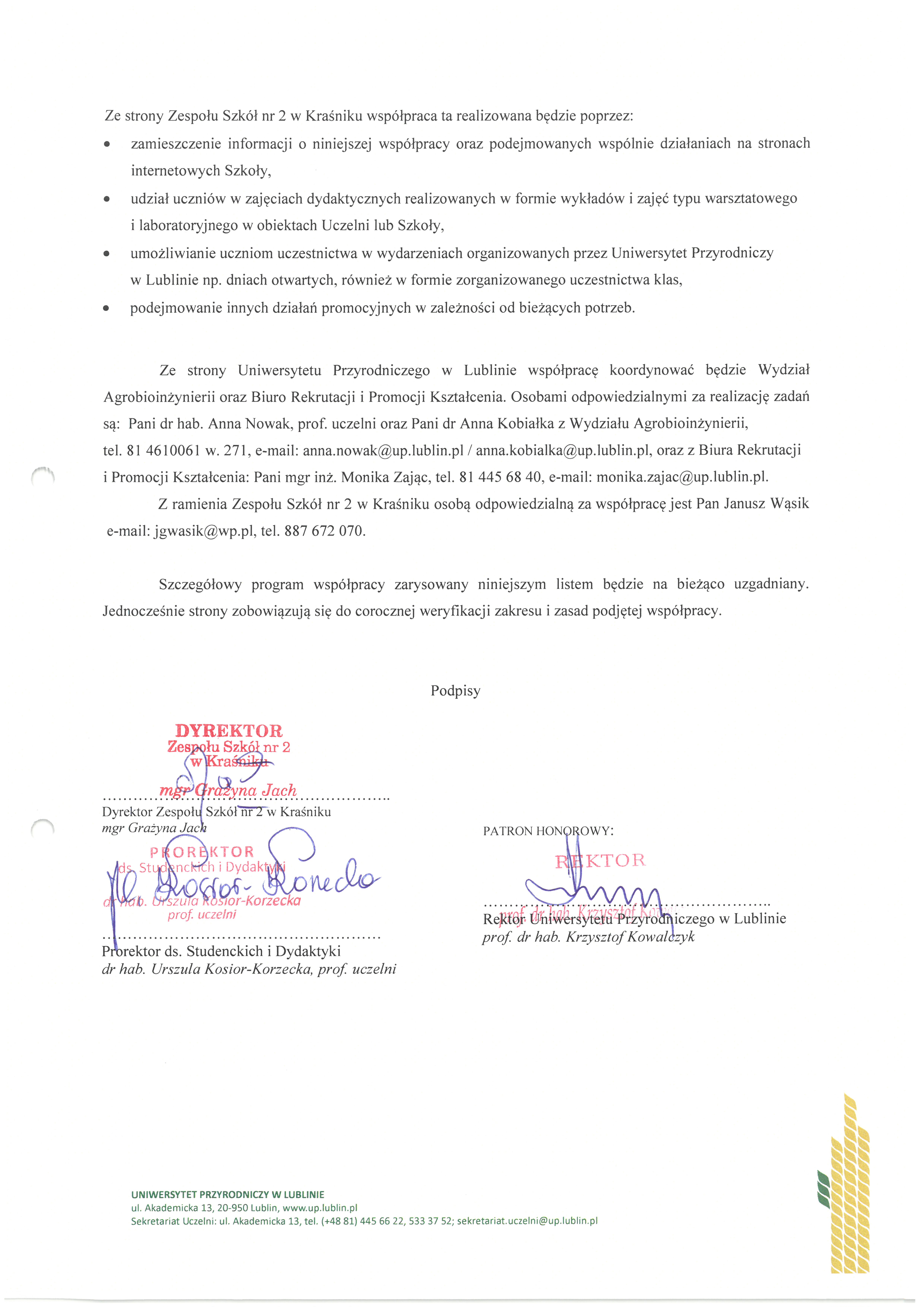29 listopada 2022r. została podpisana umowa o współpracy między Uniwersytetem Przyrodniczym w Lublinie a Zespołem Szkół nr 2 w Kraśniku. Celem inicjatywy jest wsparcie edukacji uczniów, szczególnie w obszarze nauk przyrodniczych i umożliwienie poszerzania ich wiedzy pod kątem uczestniczenia w olimpiadach i konkursach przedmiotowych. W ramach współpracy, istnieje możliwość wykorzystania bazy dydaktycznej uczelni oraz zdobycia konkretnych, praktycznych umiejętności przydatnych i przygotowujących do przyszłej pracy zawodowej. Jednym z koordynatorów współpracy z naszą szkołą jest Pani dr hab. Anna Nowak, prof. uczelni z Katedry Ekonomii i Agrobiznesu, absolwentka Reja.