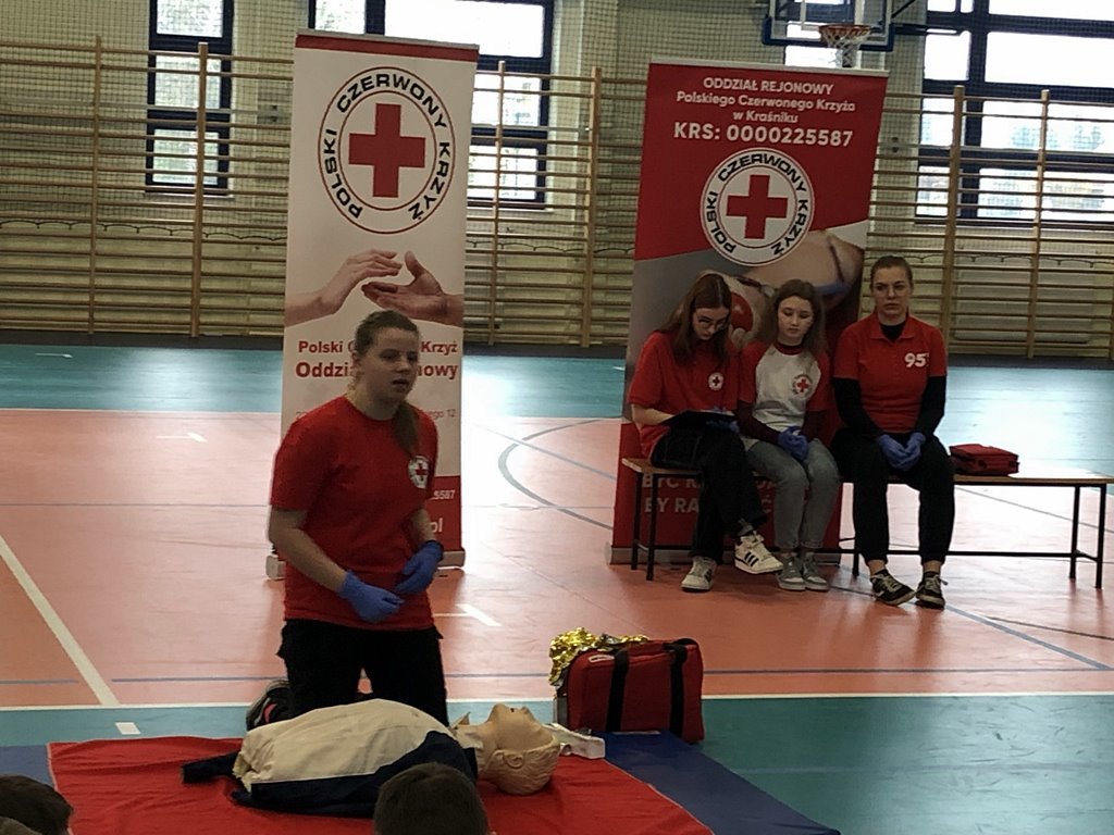 z powodzeniem prowadzi takie szkolenia dla szkół w regionie. Ostatnio, w dniu 18 kwietnia 2023 r., delegacja czterech uczniów z Zespołu Szkół nr 2 w Kraśniku, zrzeszonych w Szkolnym Kole PCK, przeprowadziła lekcję dla 80 uczniów klas czwartych, piątych, szóstych i siódmych Zespołu Placówek Oświatowych im. Batalionów Chłopskich w Terpentynie.