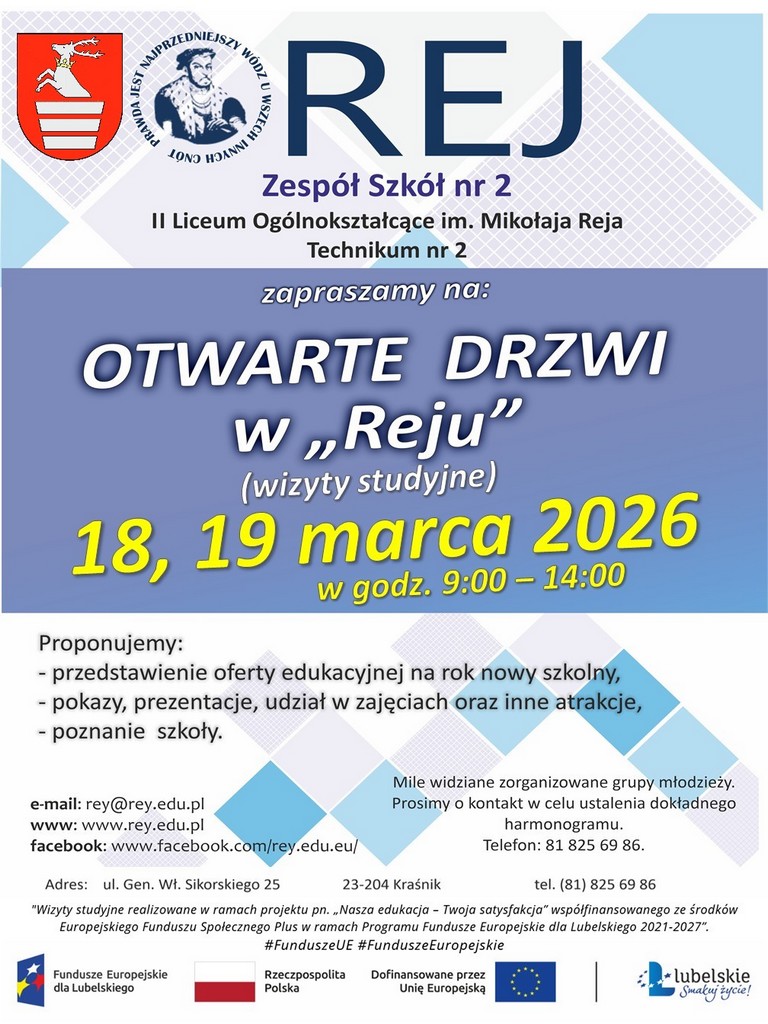Nasza szkoła zaprezentowała swoją ofertę edukacyjną na Targach Edukacyjno-Zawodowych. Wydarzenie miało miejsce 15 kwietnia 2026 r. w Zespole Szkół nr 3 w Kraśniku i zostało zorganizowane przez Starostwo Powiatowe w Kraśniku oraz Powiatowy Urząd Pracy w Kraśniku w ramach projektu „Nasza edukacja – Twoja satysfakcja”, współfinansowanego ze środków Europejskiego Funduszu Społecznego Plus (Program Fundusze dla […]