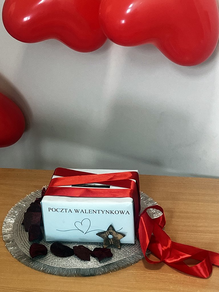 Nie mogło również zabraknąć tradycyjnej poczty walentynkowej. Na jednym z korytarzy została umieszczona skrzyneczka, do której można było wrzucić karteczki i serduszka z wyrazami sympatii dla osób, które lubimy i darzymy szczególnym uczuciem. Następnie walentynkowi listonosze posegregowali pocztę i roznosili do adresatów korespondencję od wielbicieli.